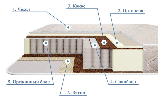 - Ватин. Настилочный материал из полушерстяного волокна используется в качестве защитного слоя. Это экологически безопасный материал, смягчающий поверхность матраса.